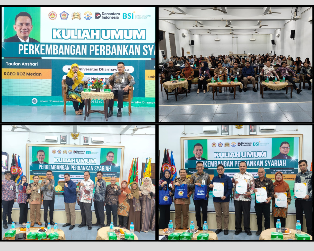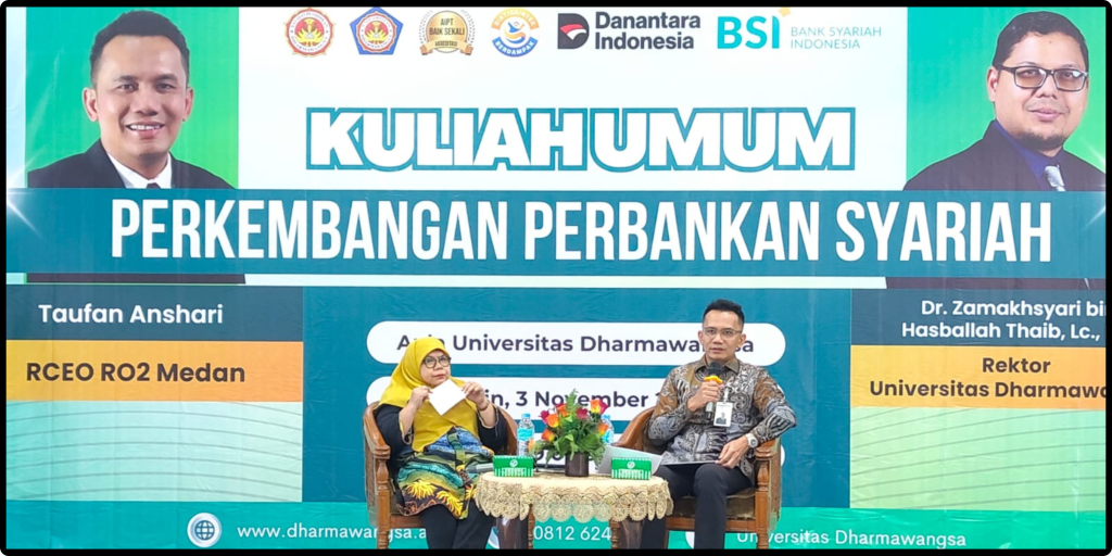 Medan, 3 November 2025 – Universitas Dharmawangsa kembali menunjukkan komitmennya dalam memperkuat kolaborasi dengan dunia industri, khususnya sektor perbankan syariah. Bertempat di Aula Universitas Dharmawangsa, telah diselenggarakan Kuliah Umum bertajuk “Perkembangan Perbankan Syariah” yang menghadirkan narasumber dari Bank Syariah Indonesia (BSI), yaitu Bapak Taufan Anshari, Regional Chief Executive Officer (RCEO) RO2 Medan.